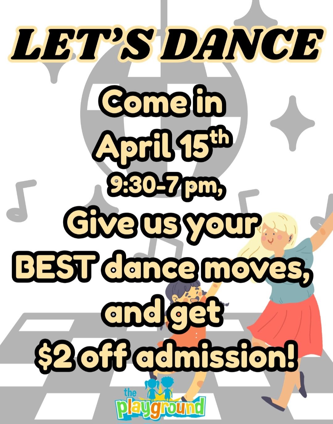 Let's Dance Wednesday, April 15, 2026 9:30 AM 7:00 PM 09:30 19:00 The Playground (map) Google Calendar ICS Show us your best dance moves as you arrive and get $2 off admission! Let's see what you got!