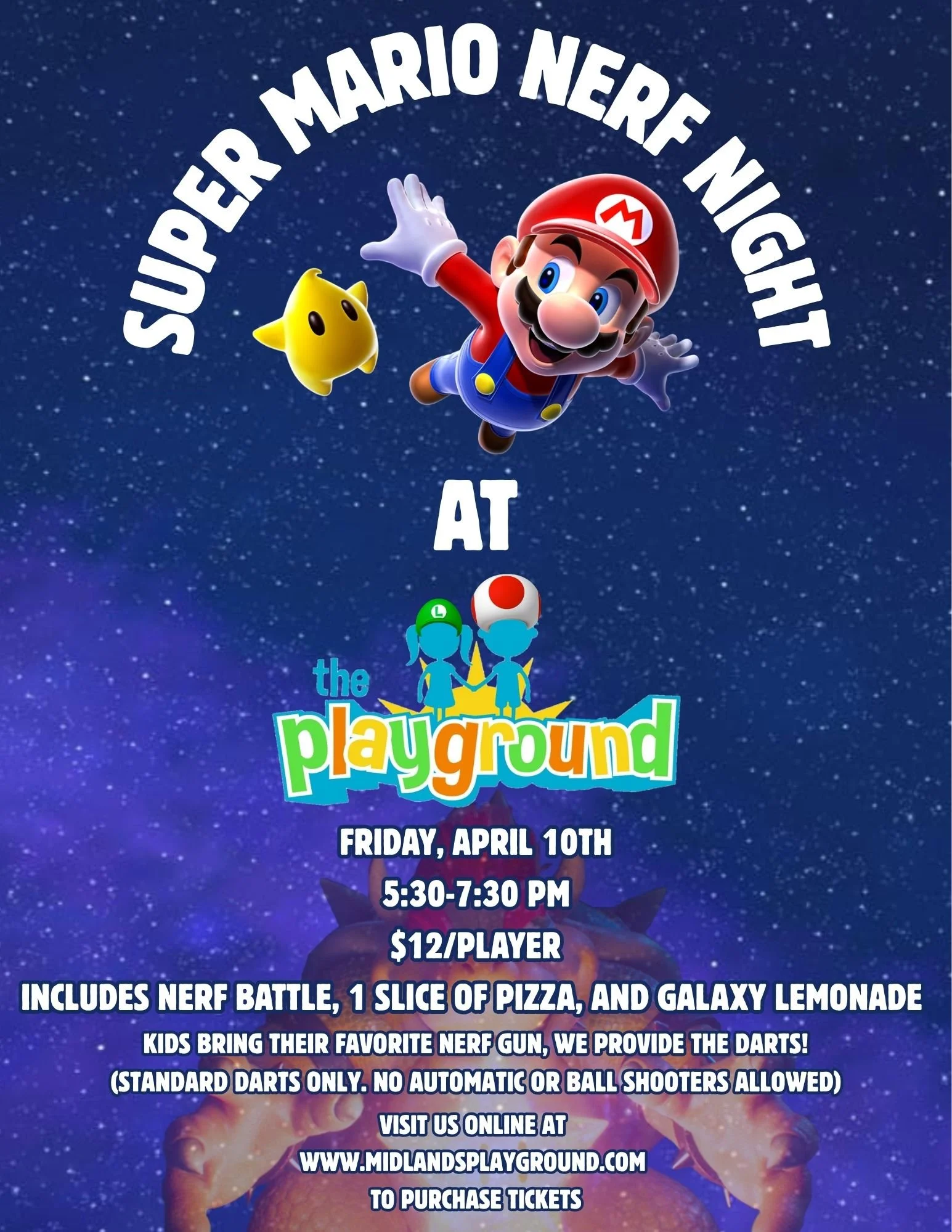 Super Mario Nerf Night! Friday, April 10, 2026 5:30 PM 7:30 PM 17:30 19:30 Google Calendar ICS Purchase Tickets Here -> Click here